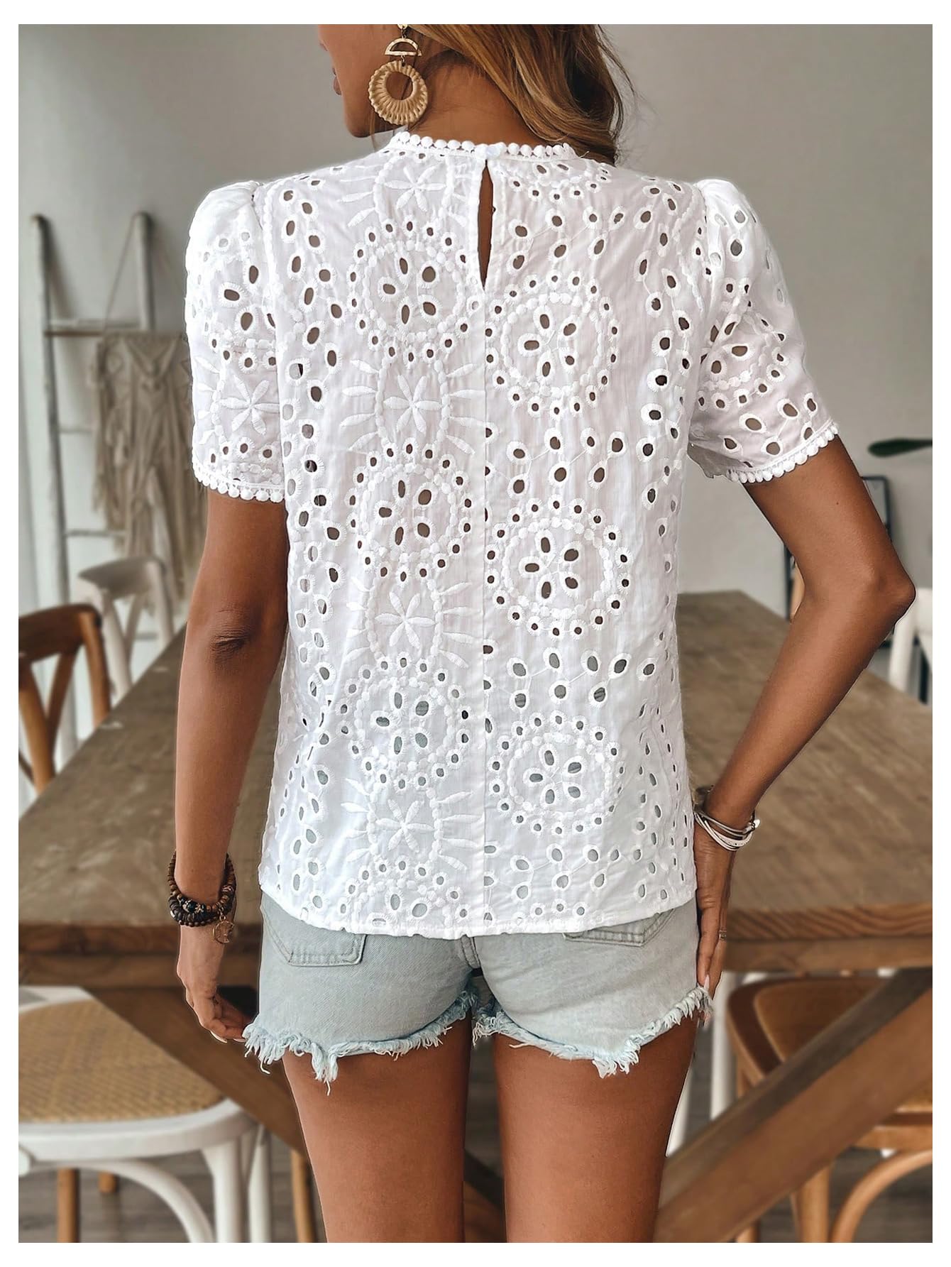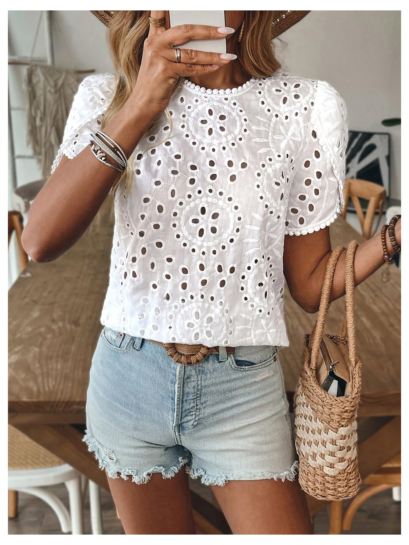 MakeMeChic Women's Going Out Eyelet Embroidery Blouse Crew Neck Hollow Out Short Sleeve Shirt Tops